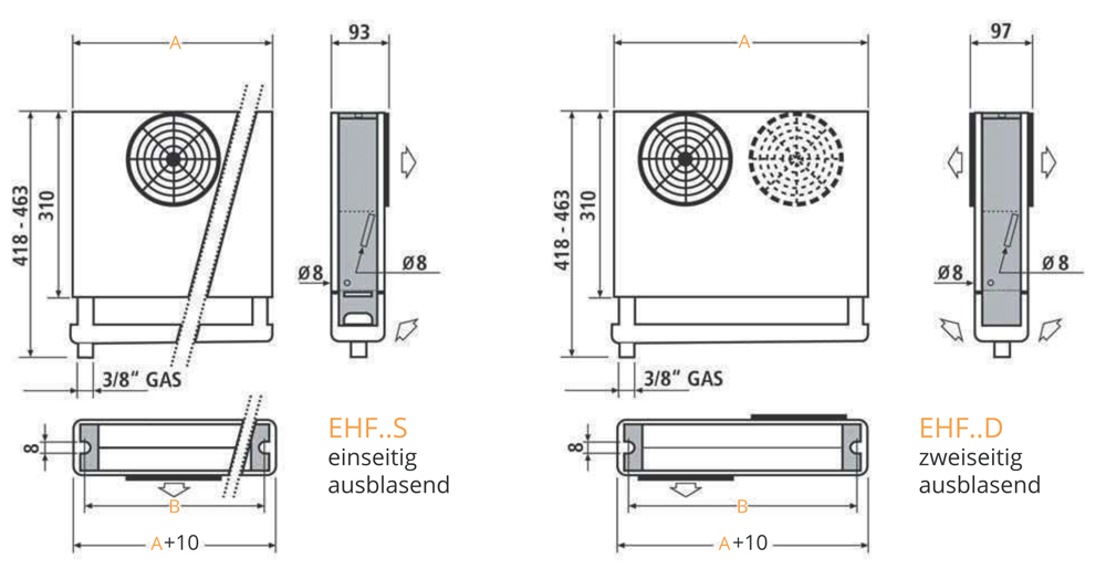 | Typ | Leistung Δ T1 10K (R404A) | Luft- durchsatz | Wurf- weite | Venti- latoren | De- frost | Leistungs- aufnahme (W) | Strom- aufnahme (A) | A | B | Ø Eintritt (mm) | Ø Austritt (mm) | Rohr- inhalt dm³ | Wärme- tauscher- fläche m³ | Gewicht (kg) |